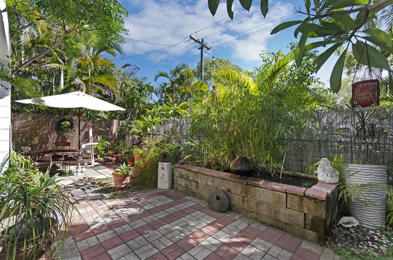 It's a lifestyle! Enter the front gate to the paved courtyard with fountain and fishpond. There's also a spacious garden to the side - store a caravan here, or as the current owner does, a makeshift storage shed. It's a totally private end unit.
