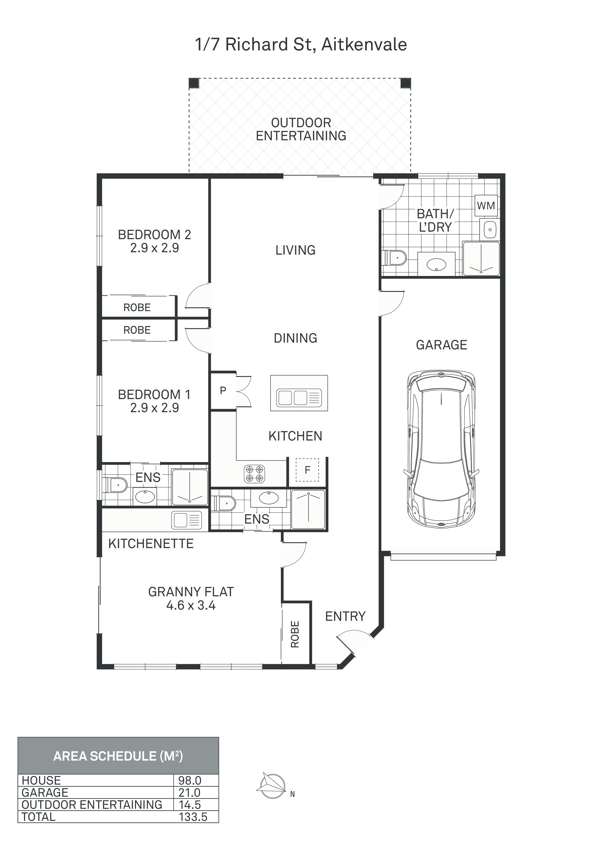 - Self-contained Granny Flat with front door and sliding door access. Features bedroom, kitchen, mirrored robe, split system air-conditioning and premium ensuite