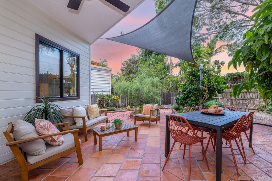 * Shaded alfresco patio with terracotta tiles, ideal for tropical dining and relaxed entertaining.