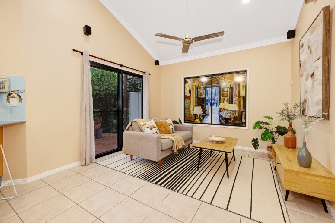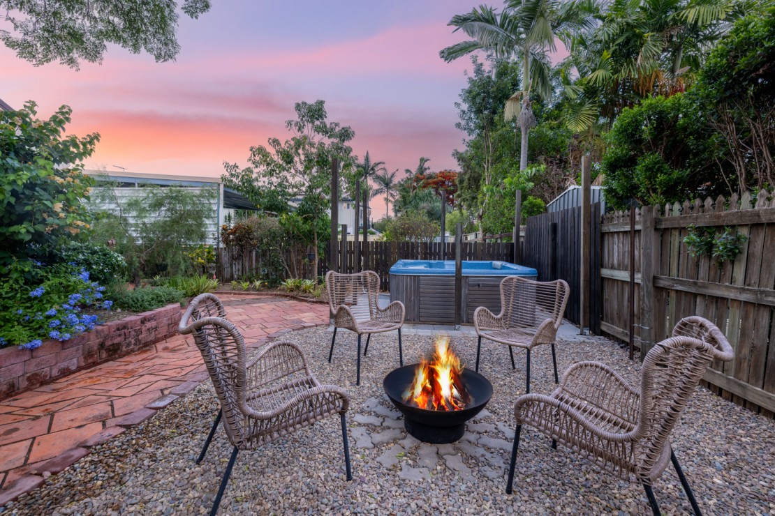 Outside is where this home truly sets itself apart. The terracotta alfresco patio invites long lunches, slow mornings and warm evenings under the shade sail. Beyond that, a private tropical garden opens into a fire-pit circle and a soothing outdoor spa, creating a retreat most inner-city addresses simply cannot offer.