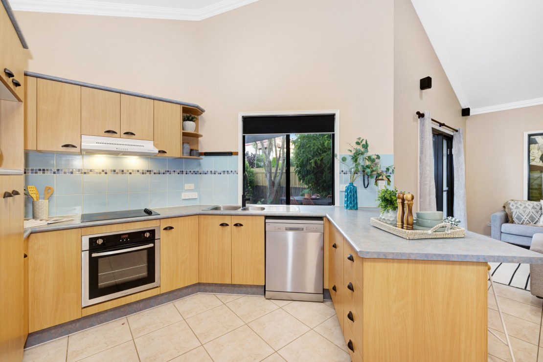 * Functional kitchen with wraparound benches and clear visibility to the outdoor entertaining area.