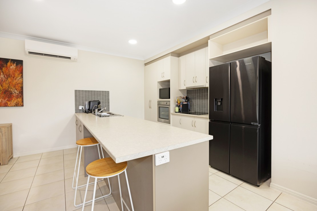 The split-system open-plan living and dining area flows seamlessly to the outdoor entertaining space. The functional kitchen includes a dishwasher, pantry and a convenient family-sized breakfast bar.