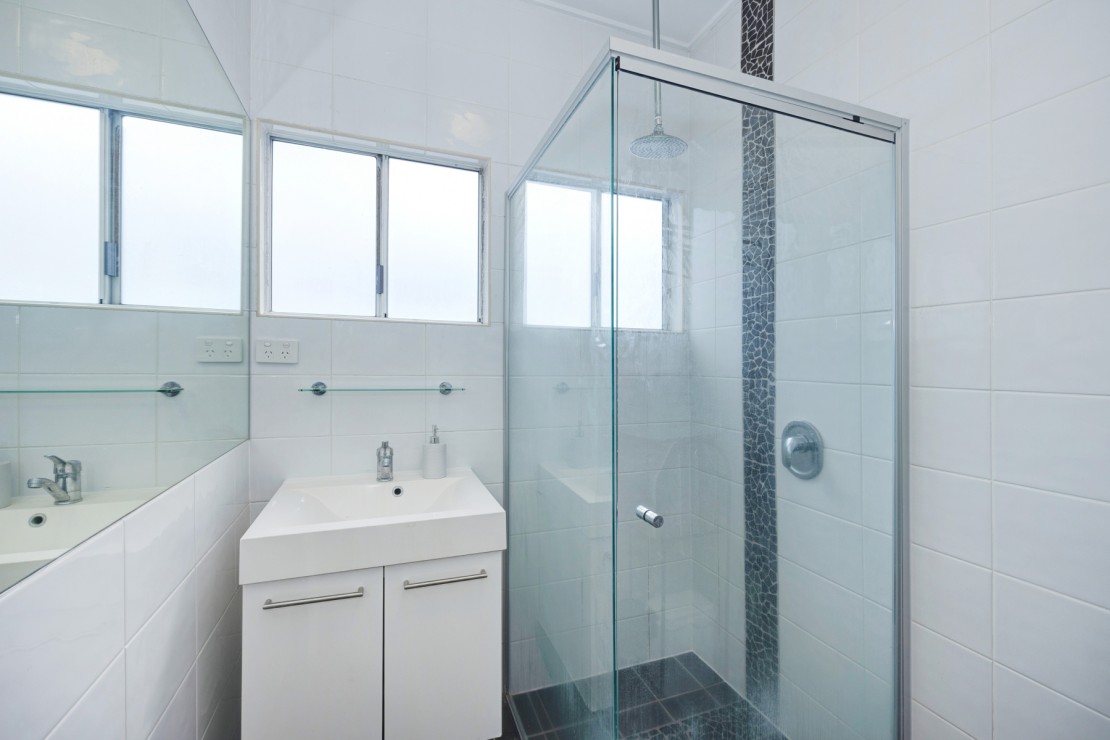 Accommodation is thoughtfully designed with two well-proportioned bedrooms positioned for privacy. The master bedroom offers generous space and storage, while the second bedroom provides flexibility for guests, a home office, or additional family living. The bathroom has been updated with a modern glass shower and clean finishes, creating a bright and functional space.