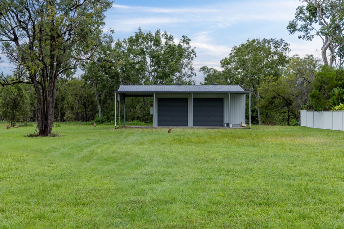 - Large powered shed with two enclosed bays ideal for vehicles or workshop space